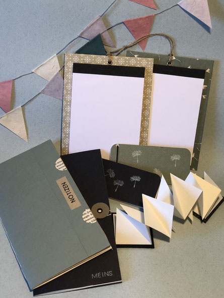 Dann möchte ich euch zeigen, wie man mit einfachen Mitteln wunderbare Notizhefte selber herstellt und gestaltet. Eine große Auswahl an Papieren steht für euch bereit.